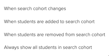 - If you want an alert only when the search cohort has changed, for example, there are new students with the selected level of attendance, but you still want to see the list of all students, tick Always show all students in notifications