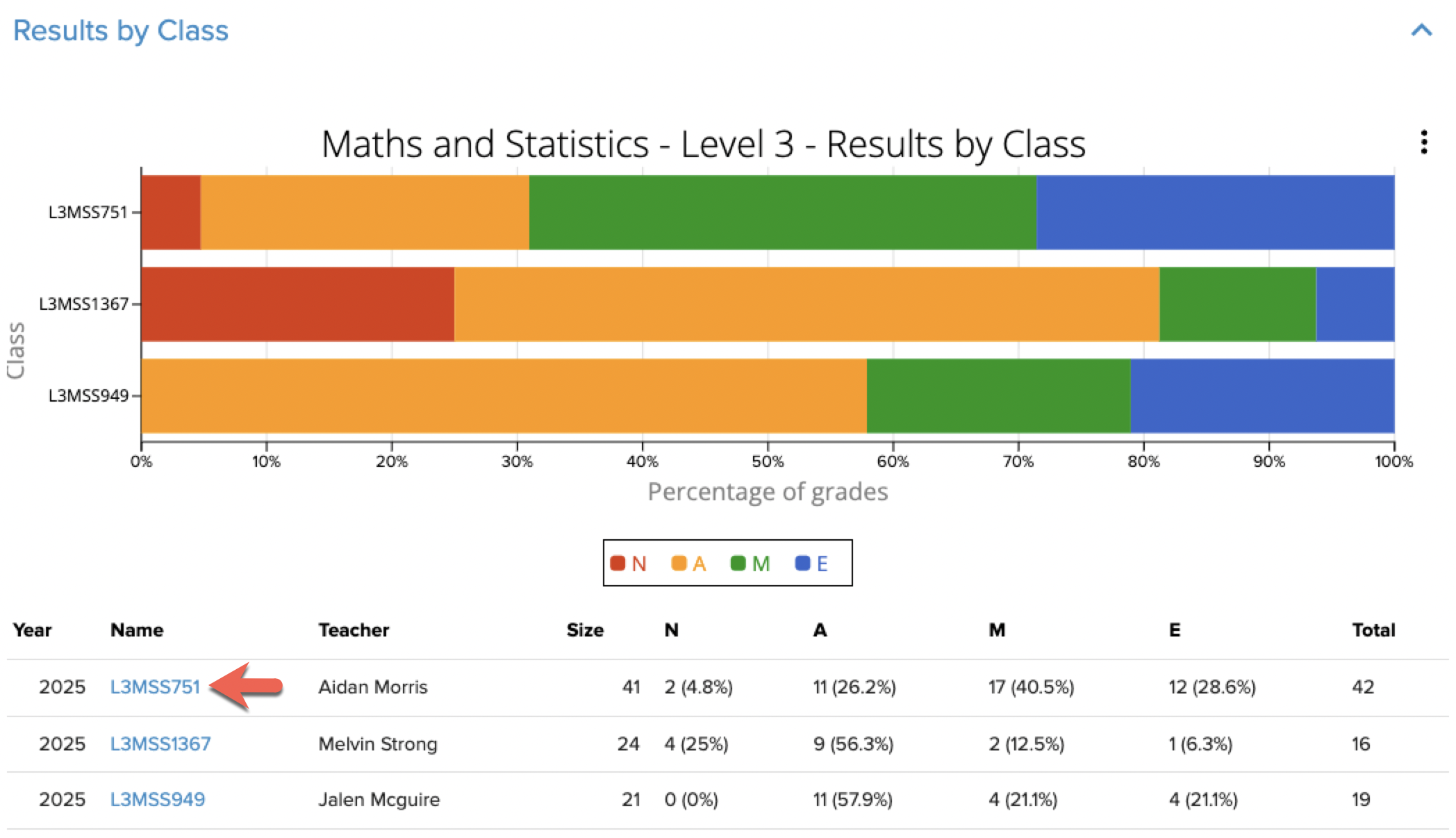 You'll also find a student list complete with NCEA grades and GPAs. The Class GPA % is based on the results in this class and can be compared to the NCEA GPA %, which is based on all results for the given student.