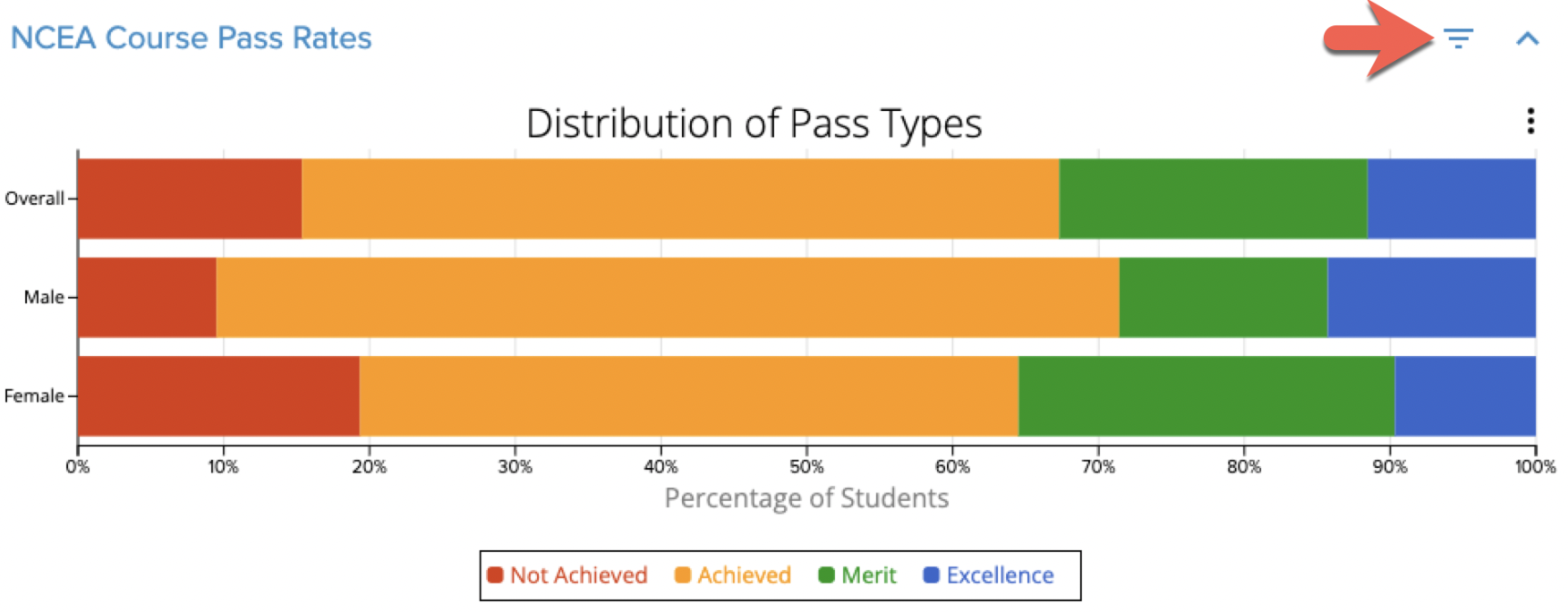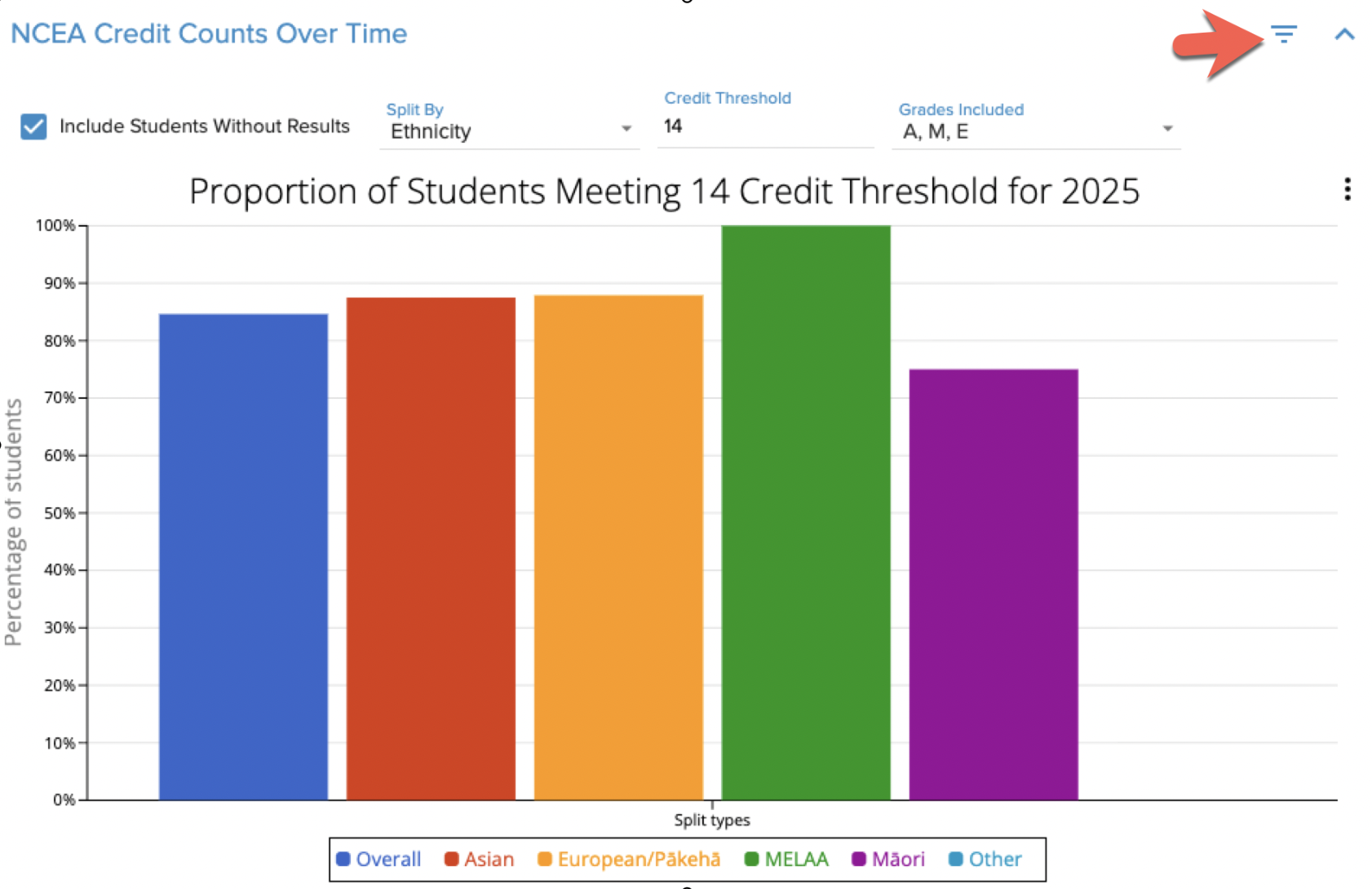 - Course pass rates: The percentage of students who have gained 14 or more credits at the given grade level. Use the filters to change the split type, the credit threshold and the grade levels included.
