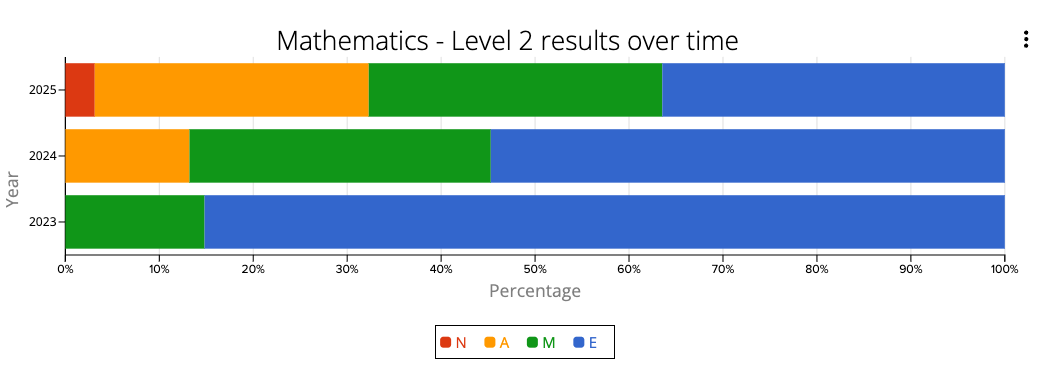 - A summary of results by year: The proportion of N, A, M, E grades each year