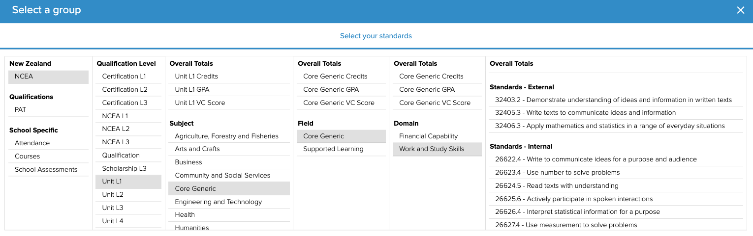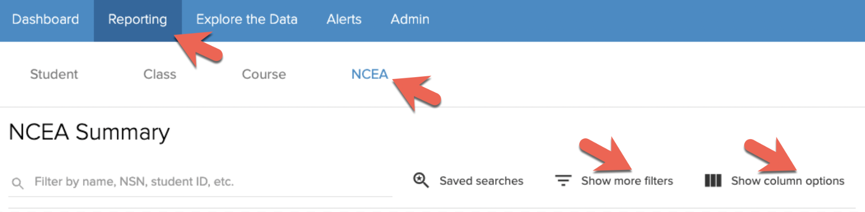 NCEA Reporting enables you to view and download a list of students who meet an NCEA-related criteria. You can choose which data fields are included in the list.