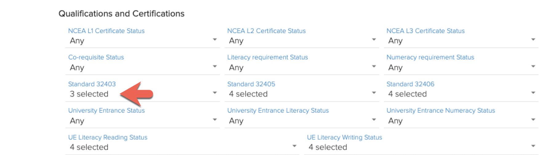 For example, to view a list of Year 11 students who have yet to pass the reading corequisite standard, 32403, select Year level 11 and untick Passed in the Standard 32403 filter.